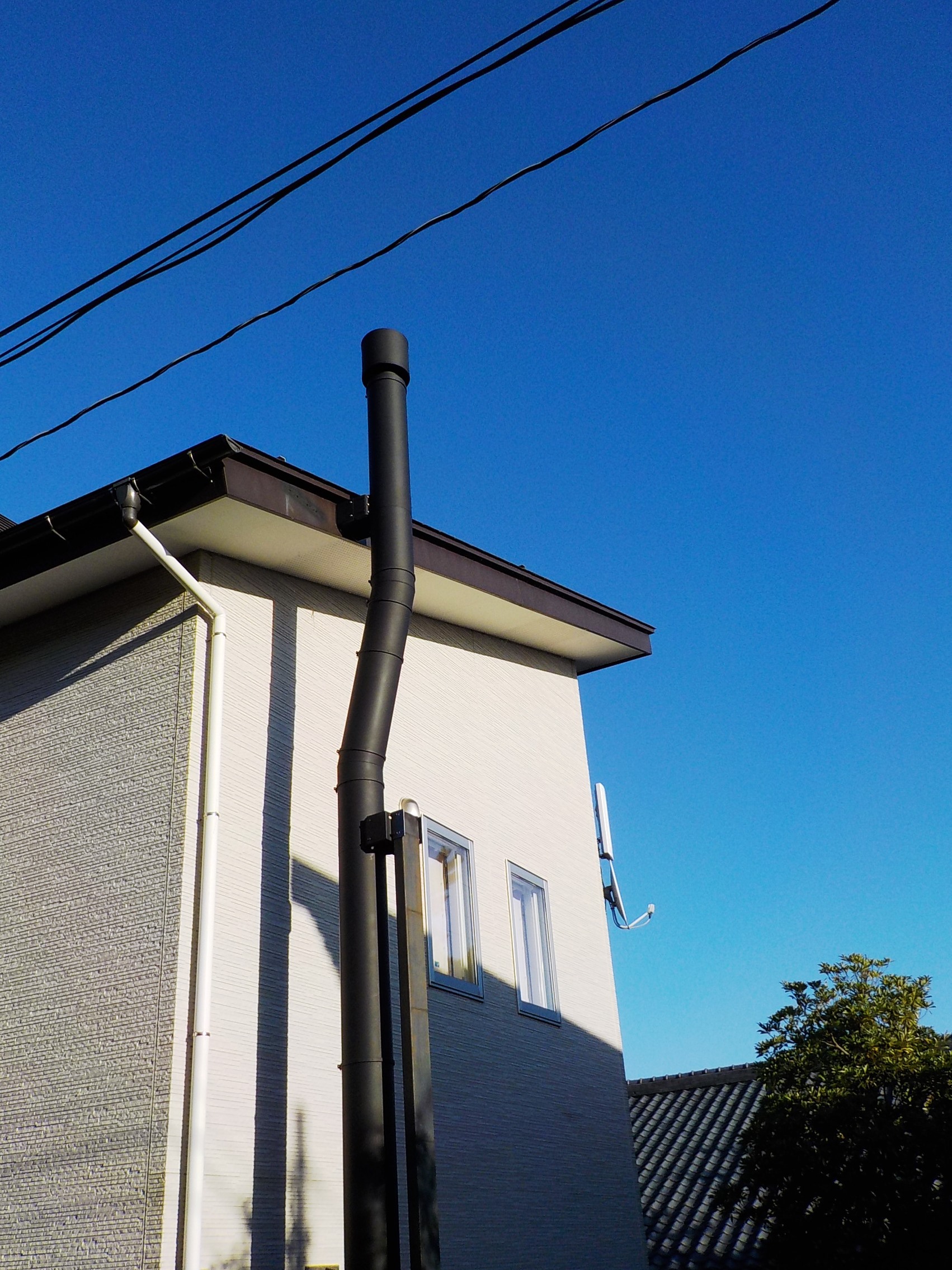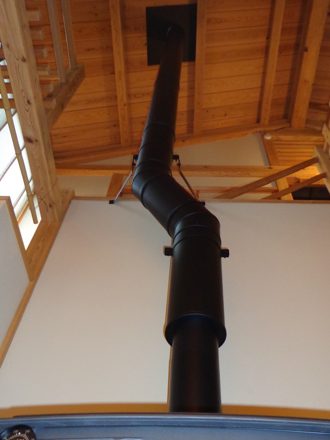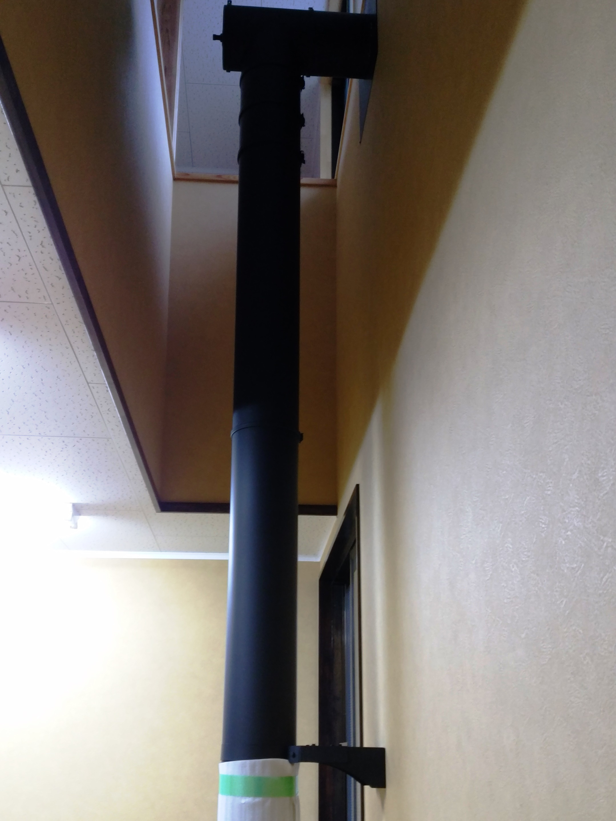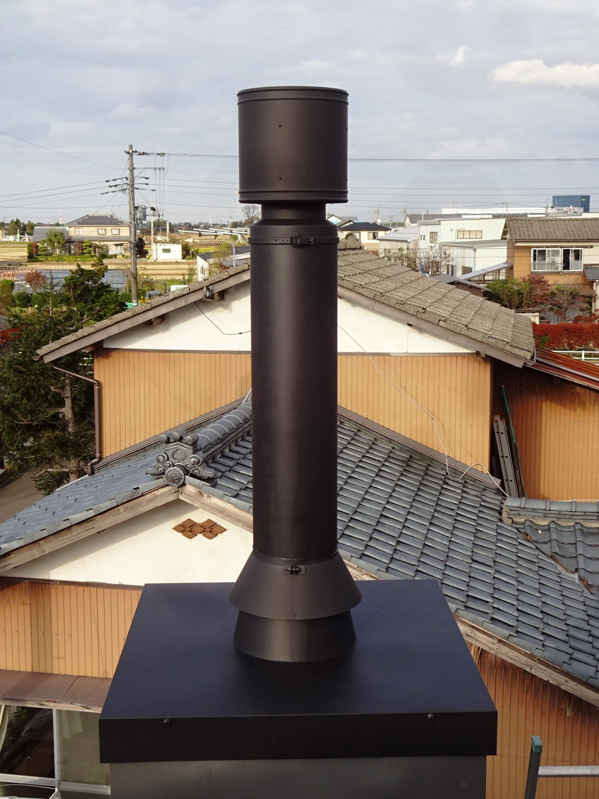 S様奥様が既存シングル煙突の疑問に室内外共に断熱二重煙を施工させて頂きました。 建築基準法、内装制限に準じた煙突施工となりました。