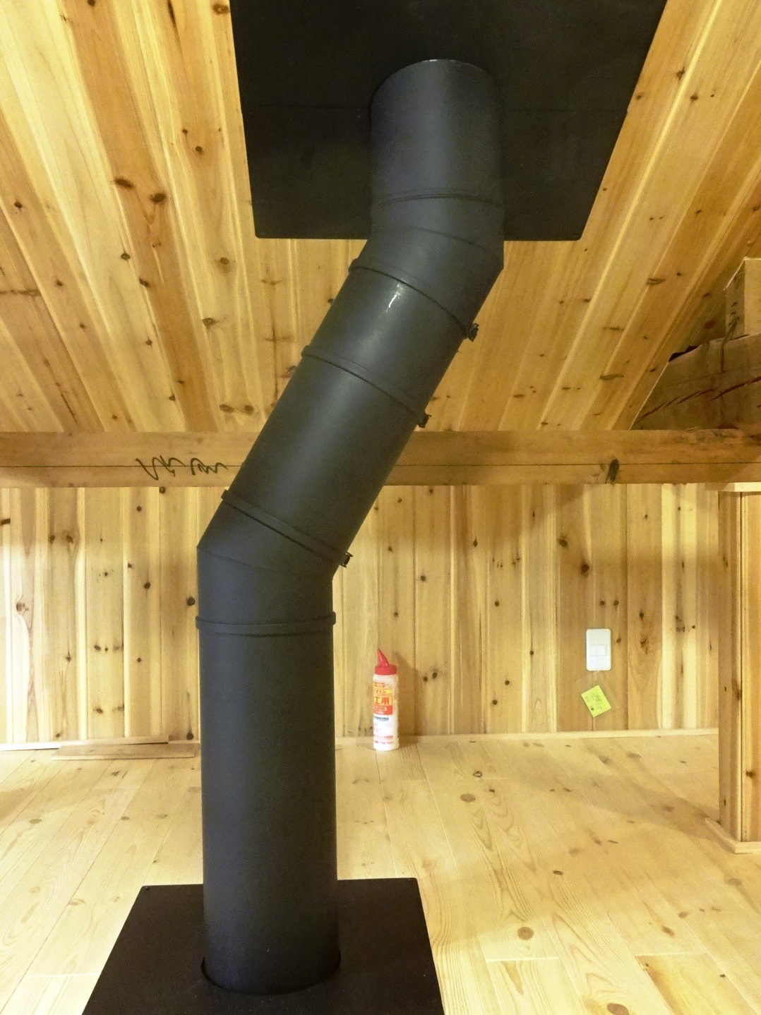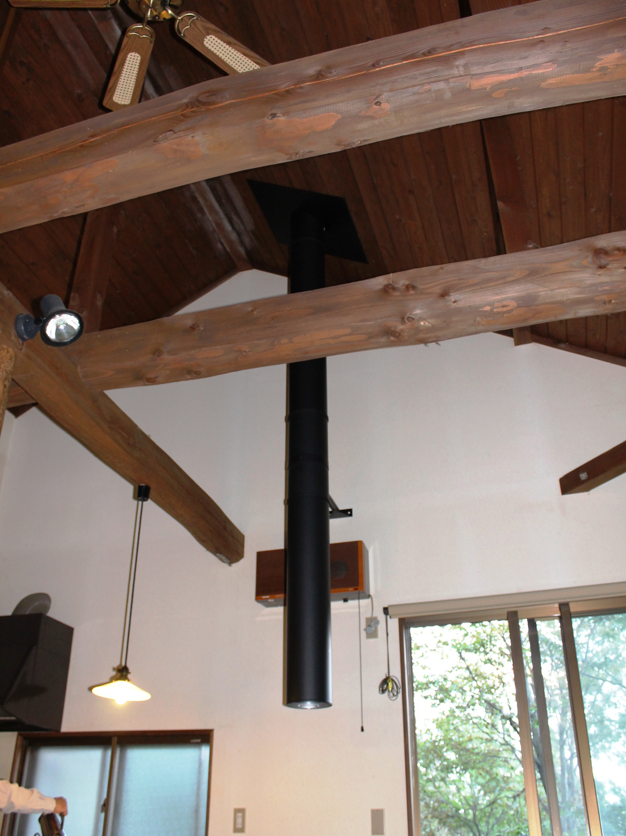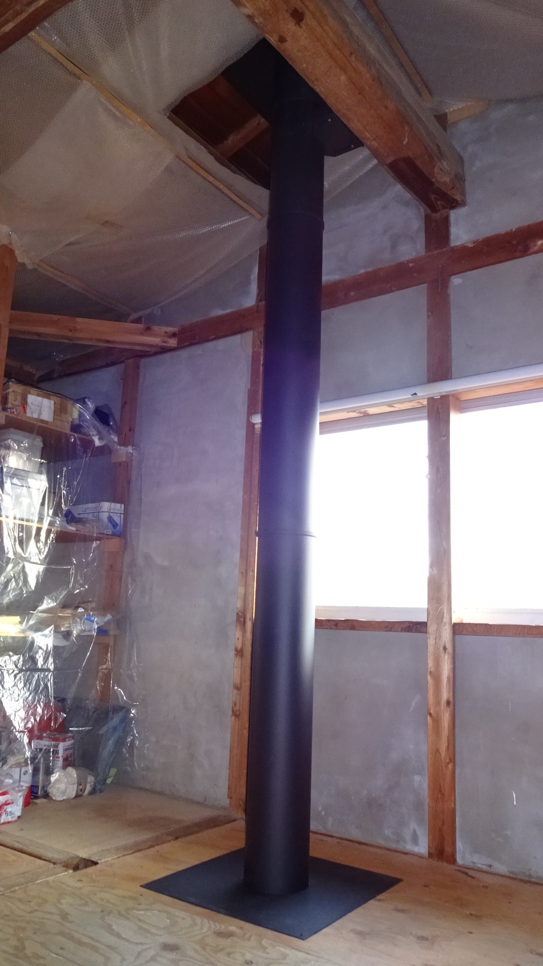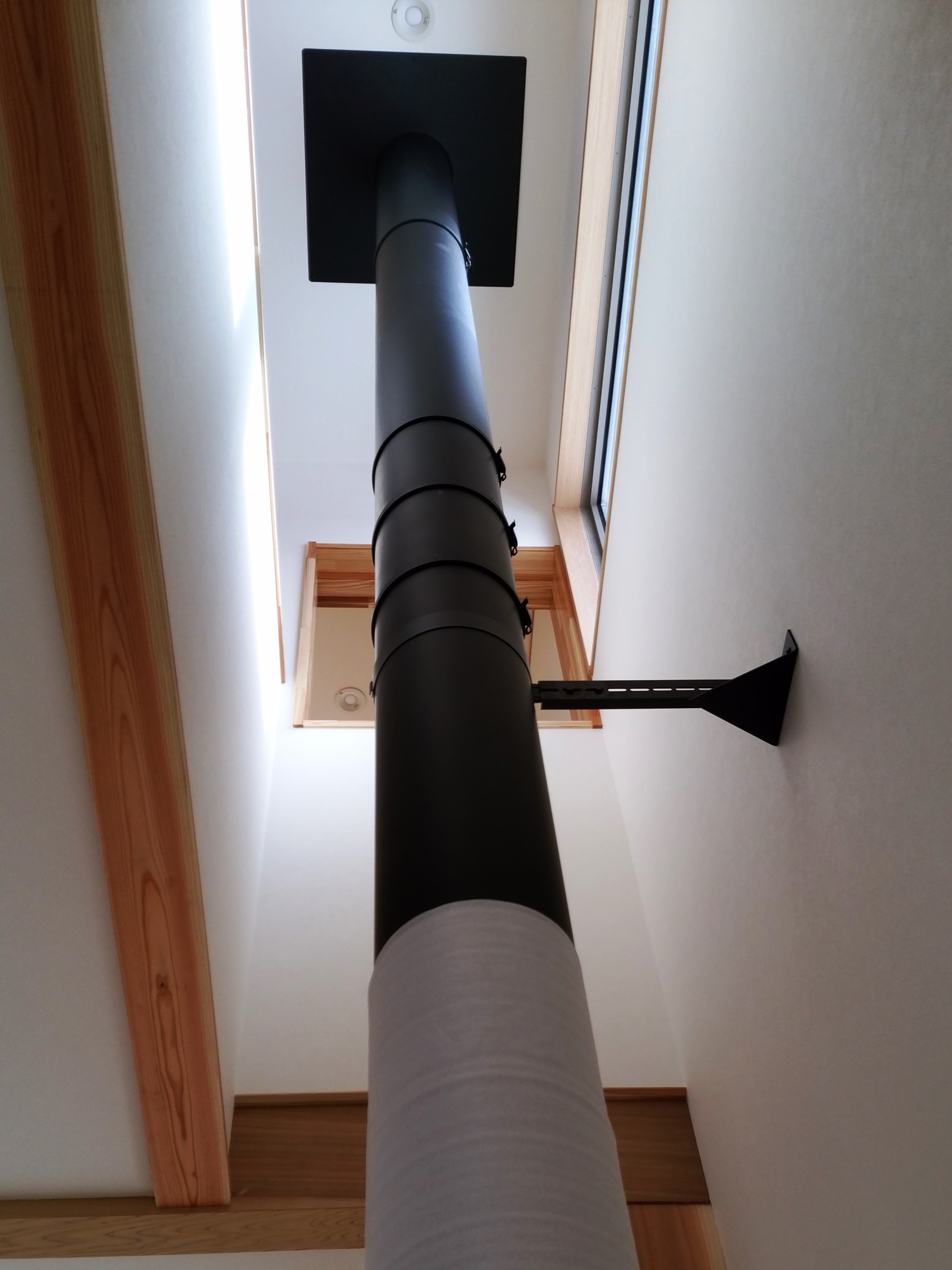 S様奥様が既存シングル煙突の疑問に室内外共に断熱二重煙を施工させて頂きました。 建築基準法、内装制限に準じた煙突施工となりました。