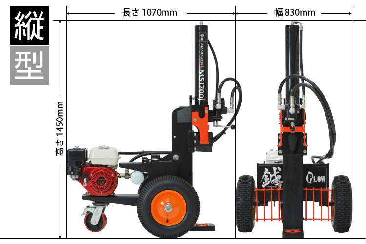 縦横兼用のエンジン式で破砕力30トンの大型薪割機。