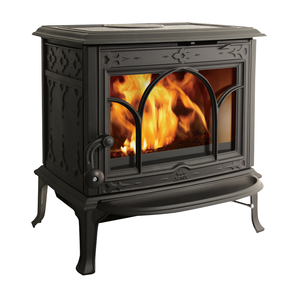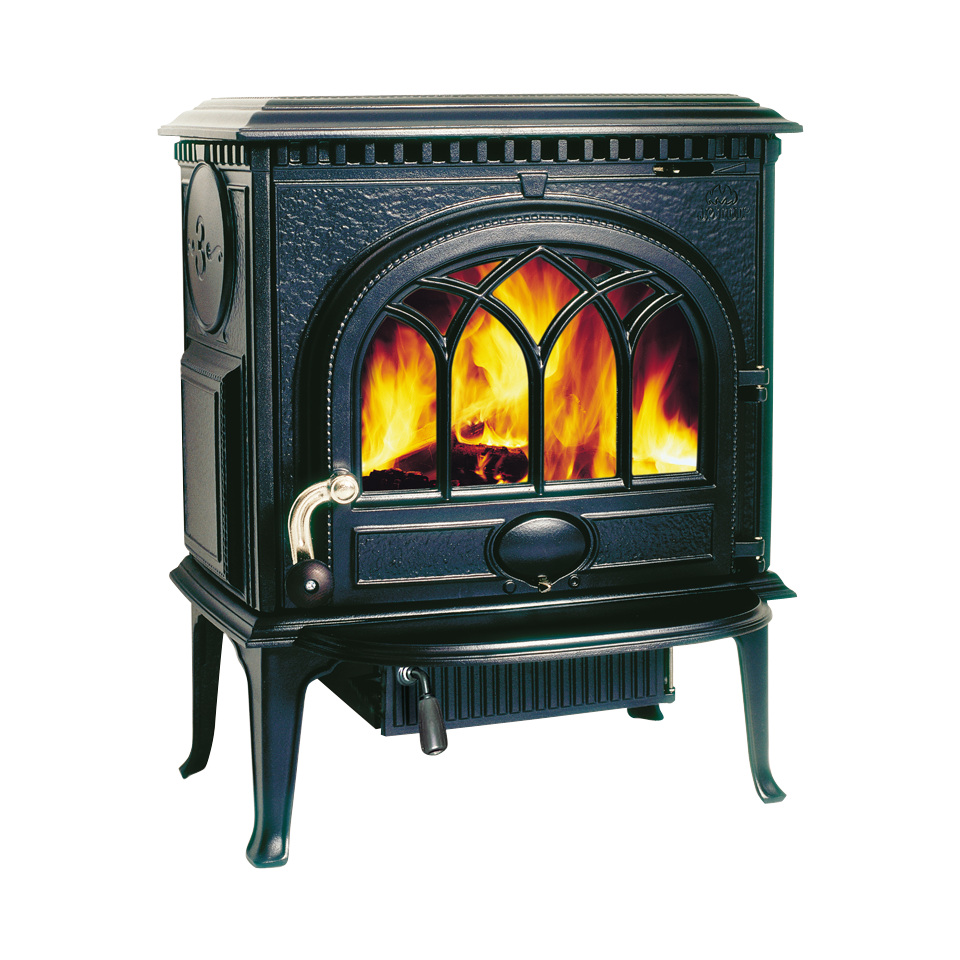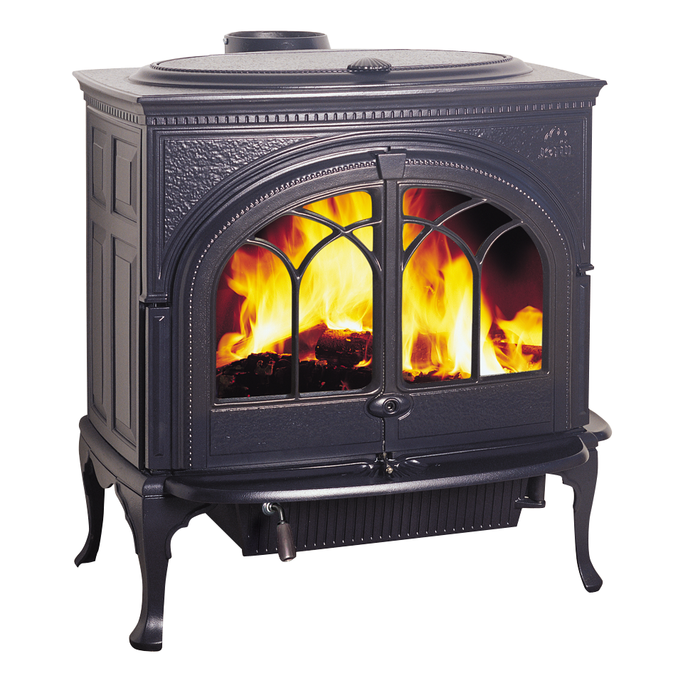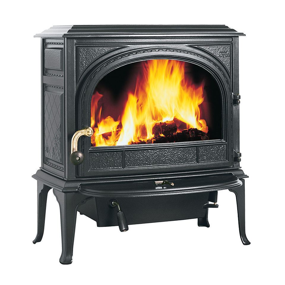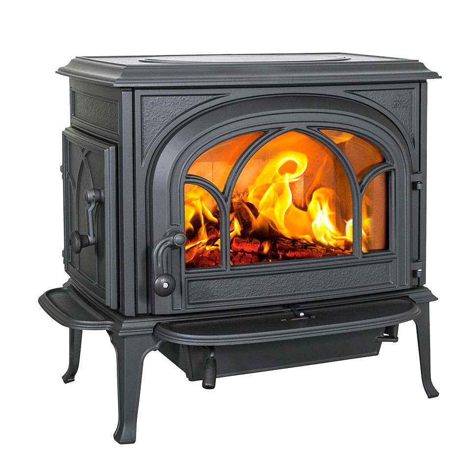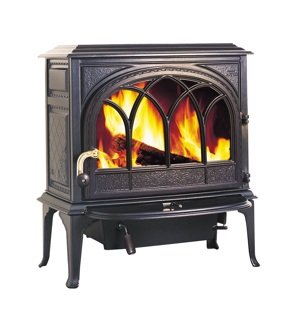 ゴシック様式のガラス扉から覗く炎が美しいモデル。燃焼室が横に広く、長い薪を投入できます。外付けの灰皿とアッシュリップが、ストーブを美しく保ちます。