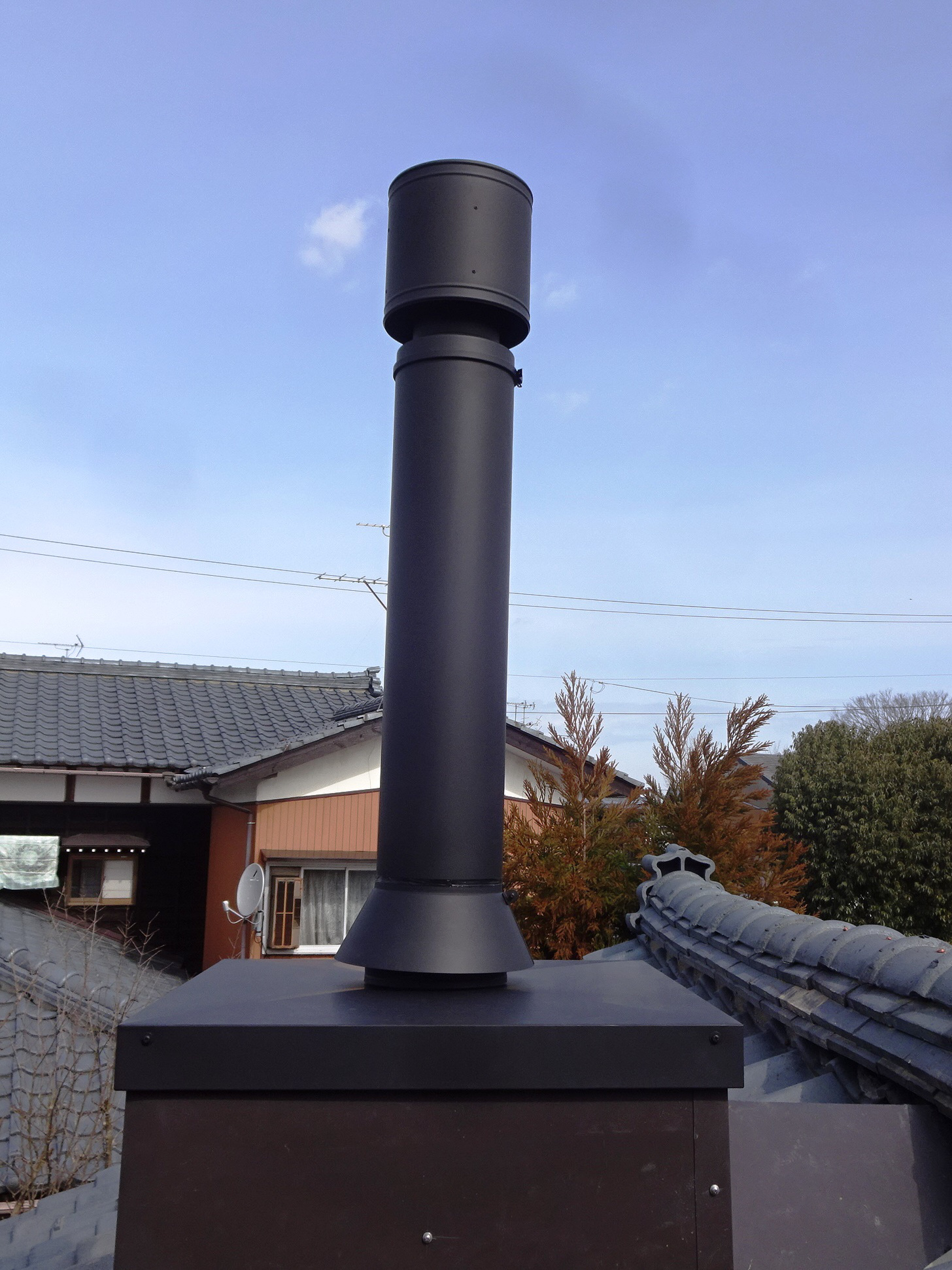 S様奥様が既存シングル煙突の疑問に室内外共に断熱二重煙を施工させて頂きました。 建築基準法、内装制限に準じた煙突施工となりました。