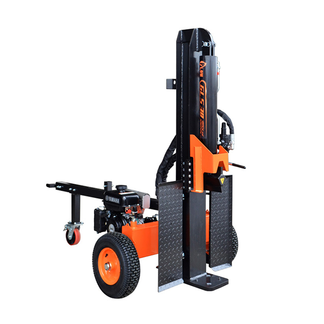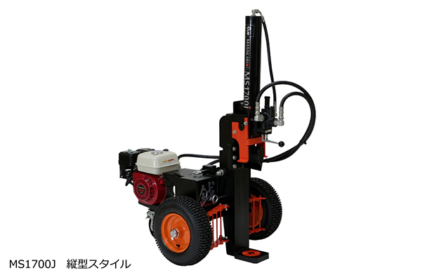 縦横兼用のエンジン式で破砕力30トンの大型薪割機。